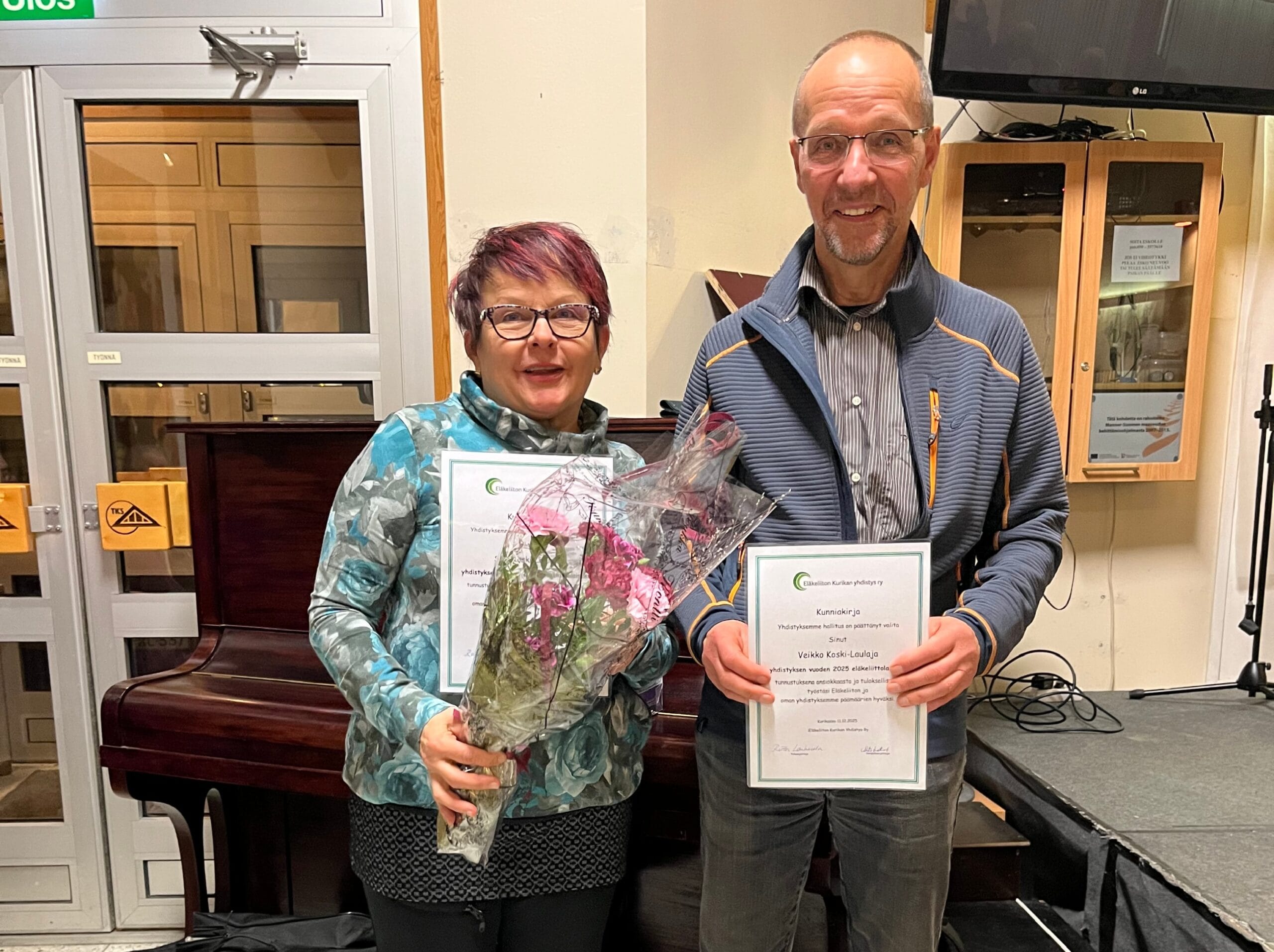 Pikkujoulussa kukitettiin vuoden eläkeliittolaiset Sari ja Veikko Koski-Laulaja. Pariskunta on tuonut toimintaamme lisää reipasta menoa. Sari on ottanut sihteerin, rahastonhoitajan ja vapaaehtoisvastaan tehtävät haltuunsa. Veikko päivitti uudet kotisivut ottaen siten haltuunsa kotisivuvastaavan tehtävät. Lisäksi Veikko toimii kerhotilamme imurointivastaavana.